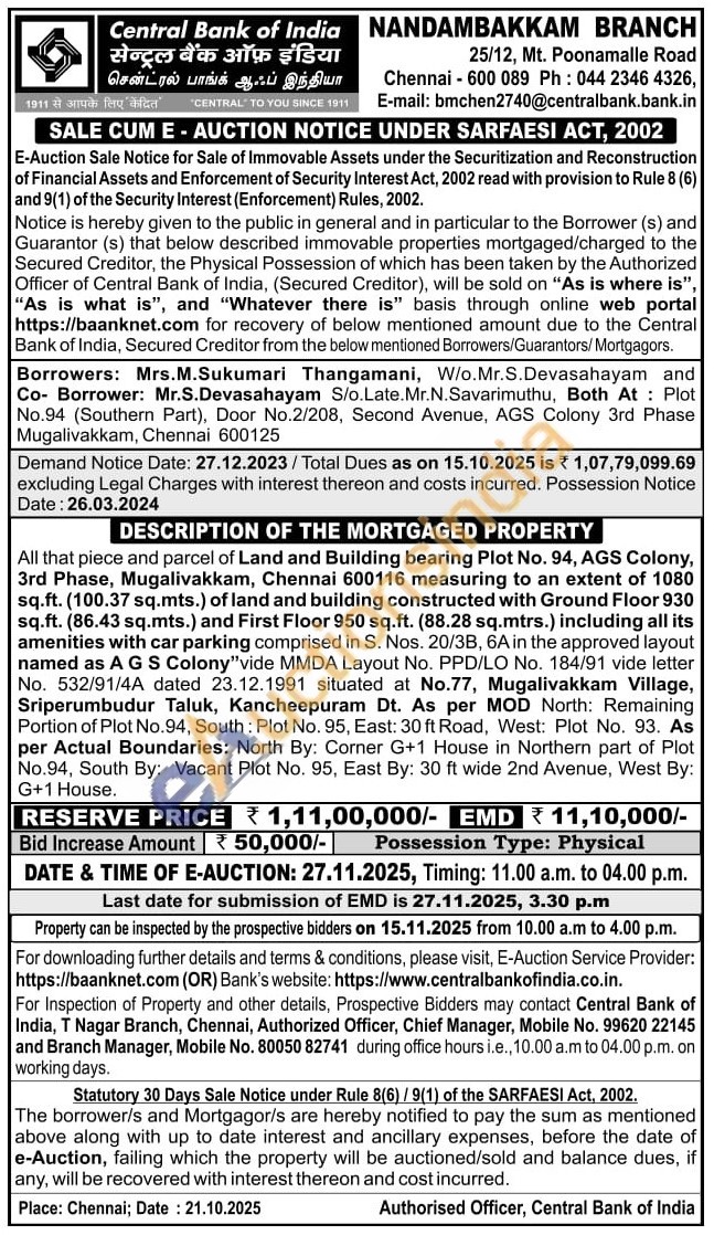 All that piece and parcel of Land and Building bearing Plot No. 94, AGS Colony, 3rd Phase, Mugalivakkam, Chennai 600116 measuring to an extent of 1080 sq.ft. (100.37 sq.mts.) of land and building constructed with Ground Floor 930 sq.ft. (86.43 sq.mts.) and First Floor 950 sq.ft. (88.28 sq.mtrs.) including all its amenities with car parking comprised in S. Nos. 20/3B, 6A in the approved layout named as A GS Colony"vide MMDA Layout No. PPD/LO No. 184/91 vide letter No. 532/91/4A dated 23.12.1991 situated at No.77, Mugalivakkam Village, Sriperumbudur Taluk, Kancheepuram Dt. As per MOD North: Remaining Portion of Plot No.94, South: Plot No. 95, East: 30 ft Road, West: Plot No. 93. As per Actual Boundaries: North By: Corner G+1 House in Northern part of Plot No.94, South By: Vacant Plot No. 95, East By: 30 ft wide 2nd Avenue, West By: G+1 House