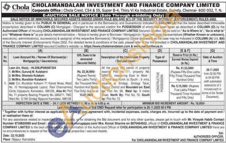 All the piece and parcel of property bearing Plot No. 71. property No 2850/71, measuring East to West 12 mtrs and North to South: 9 mirs, situated at Sindagi. Sindagi Taluk, Bijapur District and Bounded on: East by: Plot No. 96, West by: 9 meter Road, North By: Plot No. 70, South by: Plot No. 72.