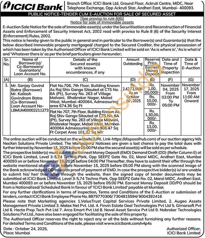 Flat No.706, 7th Floor, Building Known As Raj Shiv Ganga Sitauted at CTS No. 6A (Pt), Survey No. 263 of Village Malvani, Bhabrekar Nagar, Malad West, Mumbai-400064, Admeasuring area 674.36 Sq Ft