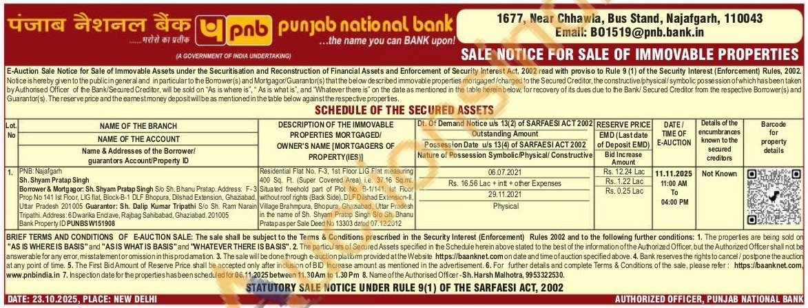 Residential Flat No. F-3, 1st Floor LIG Fiat measuring 400 Sq. Ft. (Super Covered Area) ie. 37.16 Sq.mt. Situated freehold part of Pict No. 8-1/141, Ist Floor , without roof rights (Back Side), DLF Dilshad Extension-Village Brahmpura, Bhopura, Ghaziabad, Uttar Pradesh in the name of Sh. Shyam Pratap Singh Sio Sh. Bhanu Pratapas per Sale Deed No 13303 dated 07.12.2012