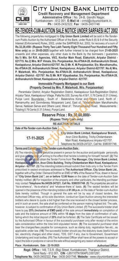 Perambalur District, Ariyalur Registration District, Keelapaluvur Sub-Registration District, Ariyalur Taluk, Keelapaluvur Village, Patta No.530, Survey No. 419/1, 0.76 Cents (0.31.0 Ares). Punjai Land. Boundaries South of Balakrishna Konar and Others Land, North of Ramamurthy and Govindarasu Moopanars Land, East of Malathankulam Maruthamuthu Servai, Natesan Serval and Others Land, West of Thirumazhapadi Road, Measurements: Totaling 0.76 Cents (0.31.0 Ares), Punjai Land,