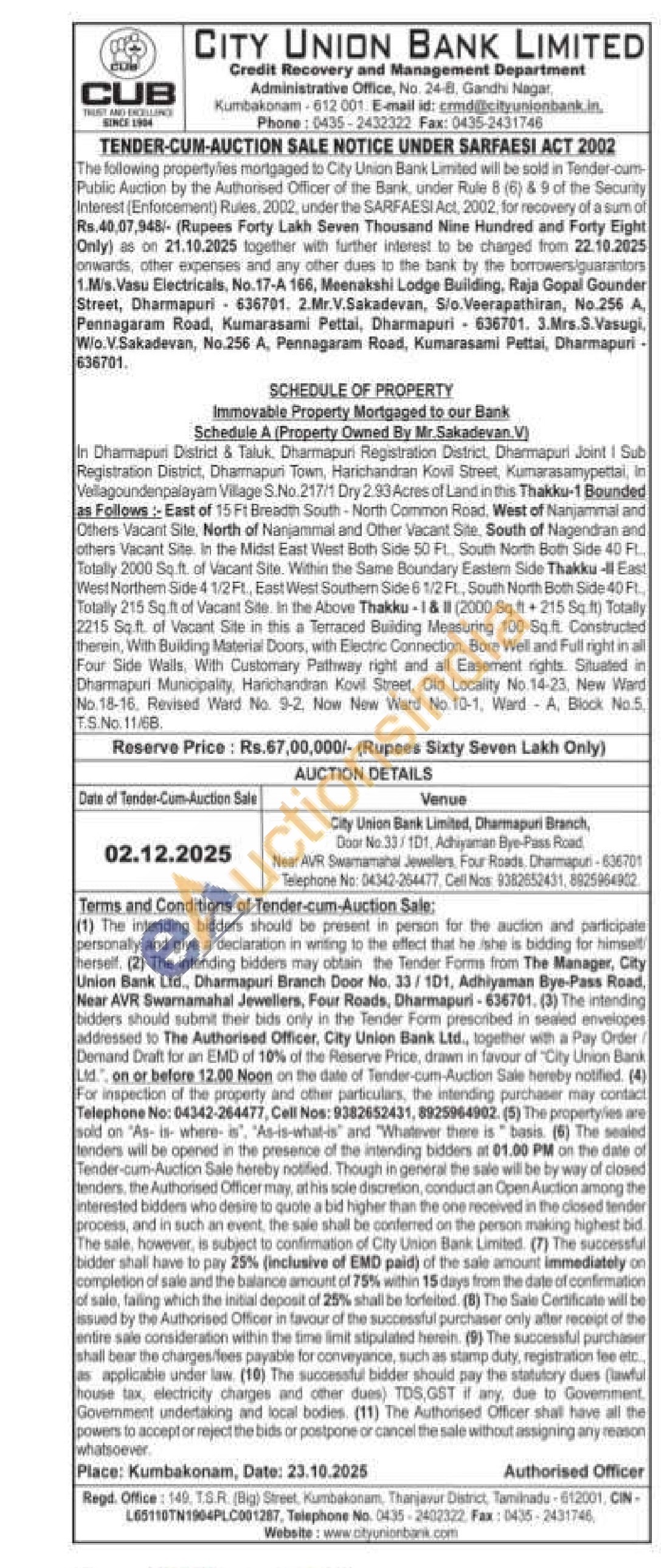 In Dharmapuri District & Taluk. Dharmapuri Registration District, Dharmapuri Joint Sub Registration District, Dharmapuri Town, Harichandran Kovil Street, Kumarasamypettal, in Vellagoundenpalayam Village S.No. 2171 Dry 2.93 Acres of Land in this Thakku-1 Bounded as Follows: East of 15 Ft Breadth South-North Common Road, West of Nanjammal and Others Vacant Site, North of Nanjammal and Other Vacant Site, South of Nagendran and others Vacant Site. In the Midst East West Both Side 50 Ft. South North Both Side 40 Ft. Totally 2000 Sq.ft. of Vacant Site. Within the Same Boundary Eastem Side Thakku - East West Northam Side 41/2 Ft, East West Southern Side 6 1/2 FL, South North Both Side 40 FL Totally 215 Sq.ft of Vacant Site in the Above Thakku-18 1 (2000 Sqft+215 Sq ft) Totally 2215 Sq.ft. of Vacant Site in this a Terraced Building Measuring 100 Sq.ft. Constracted therein, With Building Material Doors, with Electric Connection, Bore Well and Full right in all Four Side Walls With Customary Pathway tight and all Easement rights. Situated in Dharmapuri Municipality, Harichandran Kovil Street, Old Locality No.14-23, New Ward No.18-16. Revised Ward No. 9-2. Now New Ward No. 10-1, Ward A. Block No.5, TS.No. 11/68