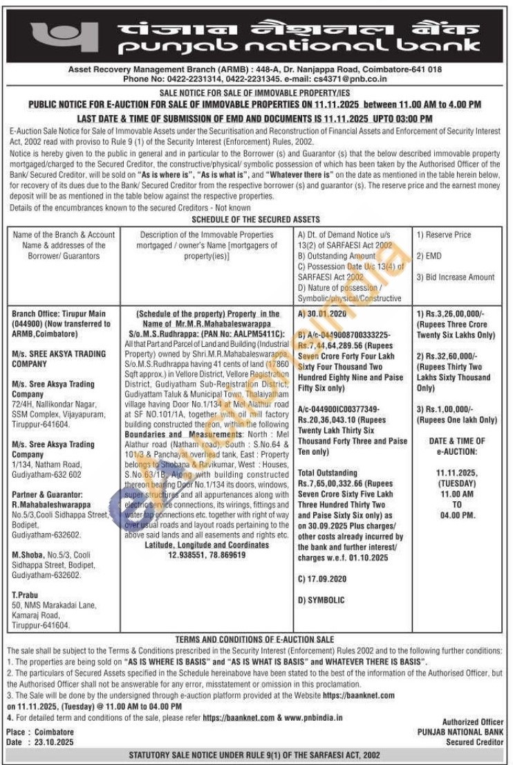 Sio.M.S.Rudhrappa: (PAN No: AALPM5411C): All that Part and Parcel of Land and Building (Industrial Property) owned by Shri.M.R.Mahabaleswarappa. S/o.M.S.Rudhrappa having 41 cents of land (17860 Sqft approx.) in Vellore District, Vellore Registration District, Gudiyatham Sub-Registration District. Gudiyattam Taluk & Municipal Town, Thalaiyatham village having Door No.1/134 at Mel Alathur road at SF NO.101/1A, together with oil mill factory building constructed thereon, within the following Boundaries and Measurements: North: Mel Alathur road (Natham road). South S.No.64 & 101/3 & Panchayat overhead tank, East: Property belongs to Shobana & Ravikumar, West Houses, S.No.63/18. Along with building constructed thereon bearing Door No. 1/134 its doors, windows, super structures and all appurtenances along with electric service connections, its wirings, fittings and water tap connections etc. together with right of way over usual roads and layout roads pertaining to the