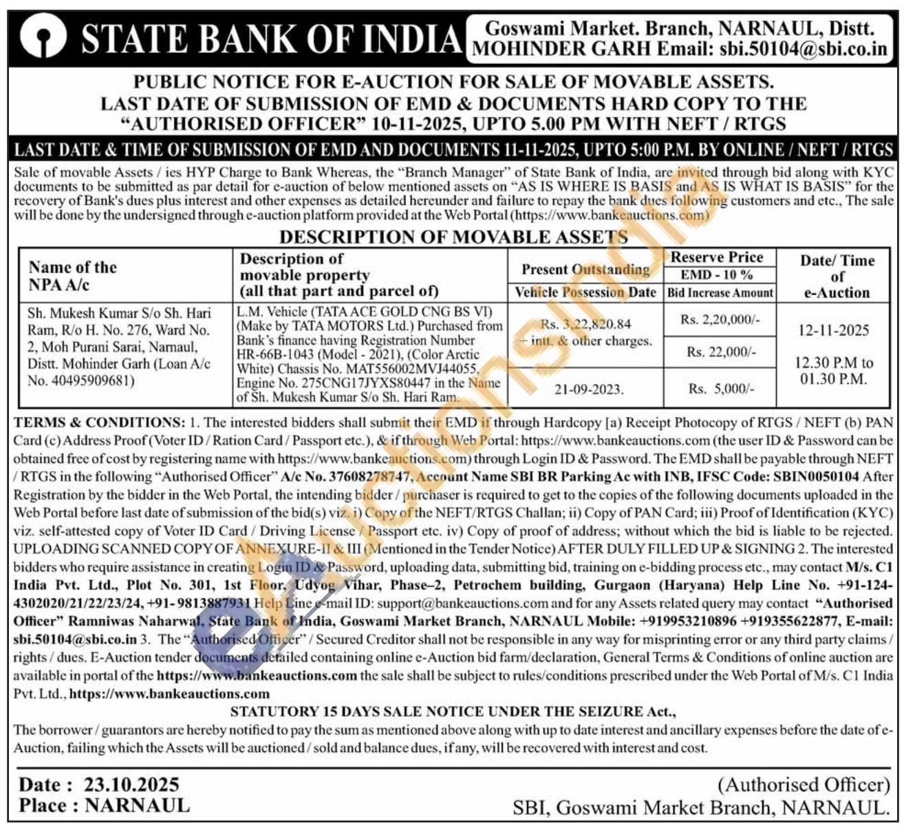 L.M. Vehicle (TATA ACE GOLD CNG BS VI) (Make by TATA MOTORS Ltd.) Purchased from Bank's finance having Registration Number HR-66B-1043 (Model-2021), (Color Arctic White) Chassis No. MAT556002MVJ44055, Engine No. 275CNG17JYXS80447 in the Name of Sh. Mukesh Kumar S/o Sh. Hari Ram.