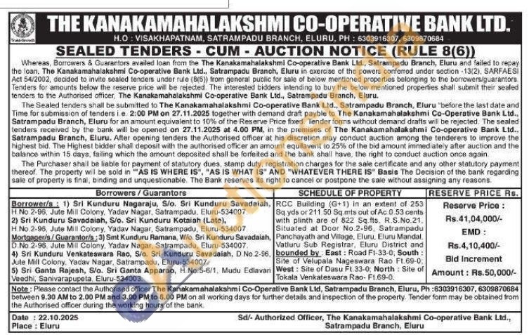 RCC Building (G+1) in an extent of 253 Sq yds or 211 50 Sq. ints out of Ac 0.53 cents with plinth are of 822 Sq.fts. R.S.No.21, Situated at Door No.2-96, Satrampadu Panchayath and Village, Eluru, Eluru Mandal, Vatluru Sub Registrar, Eluru District