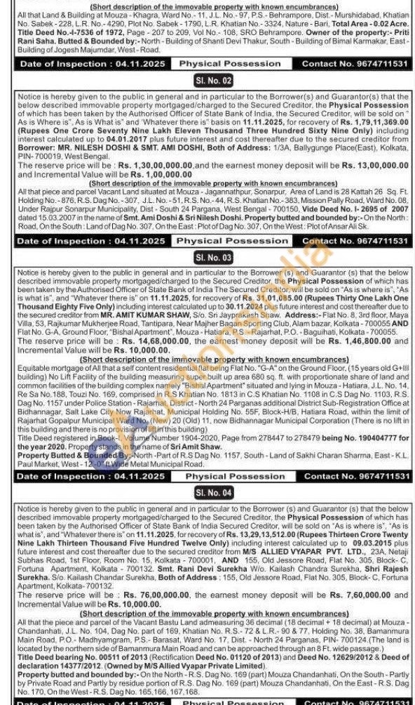All that Land & Building at Mouza-Khagra, Ward No.-11, J.L. No. 97, P.S-Behrampore, Dist-Murshidabad, Khatian No. Sabek-228, L.R. No.-4290, Plot No. Sabek-1790, L.R. Khatian No.-3324, Nature-Bari, Total Area-0.02 Acre. Title Deed No.4-7536 of 1972, Page-207 to 209, Vol No.- 108, SRO Behrampore. Owner of the property:- Priti Rani Saha. Butted & Bounded by:-North-Building of Shanti Devi Thakur, South-Building of Bimal Karmakar, East-Building of Jogesh Majumdar, West-Road.