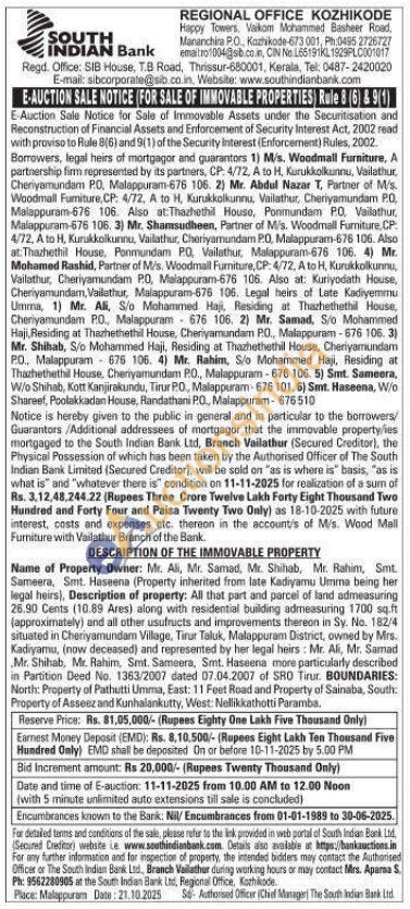 Name of Property Owner: Mr. Ali, Mr. Samad, Mr. Shihab, Mr. Rahim, Smt. Sameera, Smt. Haseena (Property inherited from late Kadiyamu Umma being her legal heirs), Description of property: All that part and parcel of tand admeasuring 26.90 Cents (10.89 Ares) along with residential building admeasuring 1700 sq.ft (approximately) and all other usufructs and improvements thereon in Sy. No. 182/4 situated in Cheriyamundam Village, Tirur Taluk, Malappuram District, owned by Mrs. Kadiyamu, (now deceased) and represented by her legal heirs: Mr. Ali, Mr. Samad Mr. Shihab, Mr. Rahim, Smt. Sameera, Smt. Haseena more particularly described in Partition Deed No. 1363/2007 dated 07.04.2007 of SRO Tirur. BOUNDARIES: North: Property of Pathutti Umma, East: 11 Feet Road and Property of Sainaba, South Property of Asseez and Kunhalankutty, West: Nellikkathotti Paramba.