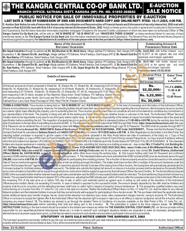 All that part and parcel of land comprised in Khata No. 16, Khatoni No. 21, Khasra No. 46, measuring 0-03-24 Hects. Khata No. 16, Khatoni No. 21, Khasra No. 54, measuring 0-14-05 Hects. Khata No. 16, Khatoni No. 21, Khasra No. 56, land measuring 0-07-76 Hects. Khata No. 18, Khatoni No. 23, Khasra No. 47, 48, 50, measuring 00-11-67 Hects. total land measuring 0-36-72 Hects. situated at Tika Machhot, Moza Anoh, Tehsil Fatehpur, PO Sathana, District Kangra (HP) and bounded as under: North: Govt Land and Plot of Sh. Purshottam Lal, South: Shops of Sh. Ramesh, Plot of Subhash/Govt. Land, East: Road (Frontage of 19 M), West: Plot Sh. Preetam Chand.