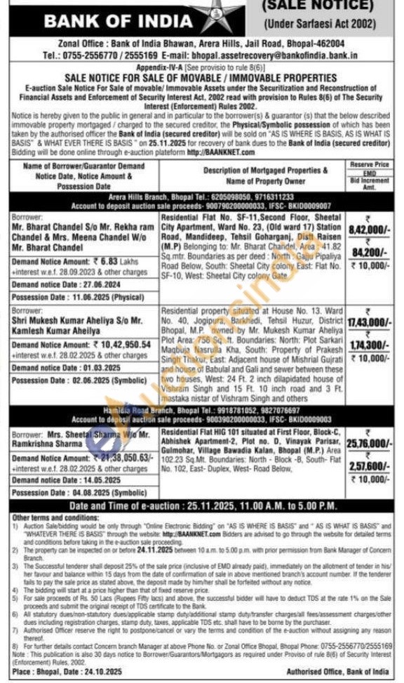 Residential Flat No. SF-11, Second Floor, Sheetal City Apartment, Ward No. 23, (Old ward 17) Station Road, Mandideep, Tehsil Goharganj, Distt Raisen (M.P) Belonging to: Mr. Bharat Chandel, Area: 41.82 Sq.mtr. Boundaries as per deed: North: Gajju Pipaliya Road Below, South: Sheetal City colony East: Flat No. SF-10, West: Sheetal City colony Gate