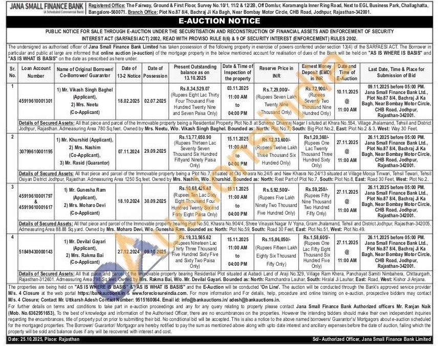 Details of Secured Assets: All that piece and parcel of the Immovable property being a Residential Property Plot No.8 at Scheme Dhanraj Nagar I situted at Khsra No. 554, Village Jhalamand, Tehsil and District Jodhpur, Rajasthan. Admeasuring Area 780 Sq.feet. Owned by Mrs. Neetu, W/o. Vikash Singh Baghel. Bounded as: North: Plot No.7, South: Big Plot No.2, East: Plot No.2 & 3, West: Way 30 Feet