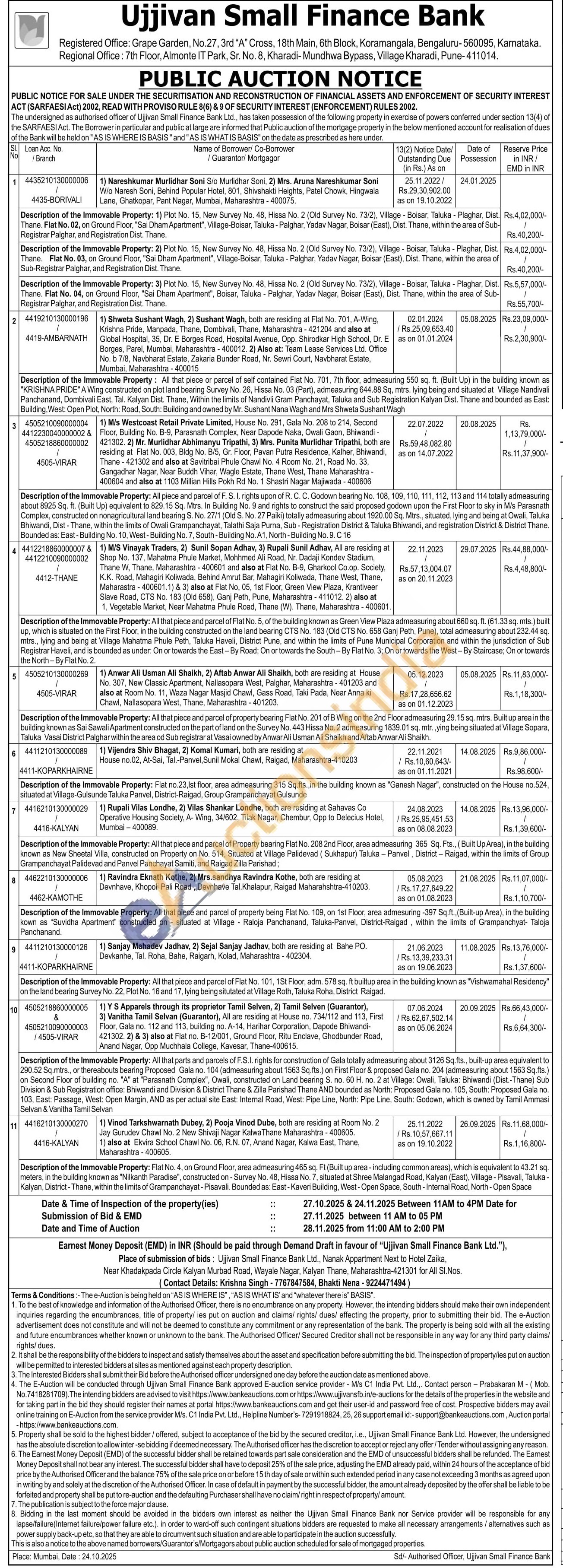 Description of the Immovable Property: All that piece and parcel of property being Flat No. 109, on 1st Floor, area admesuring -397 Sq.ft., (Built-up Area), in the building kown as "Suvidha Apartment" constructed on situated at Village Raloja Panchanand, Taluka-Panvel, District-Raigad, within the limits of Grampanchyat- Taloja Panchanand.