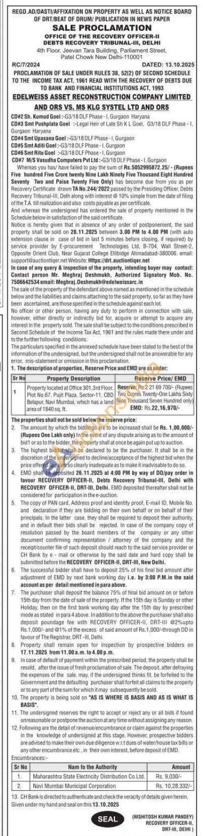 Property located at Office 301, 3rd Floor, Plot No.67, Pujit Plaza, Sector-11, CBD Belapur, Navi Mumbai, which has a land area of 1840 sq. ft.