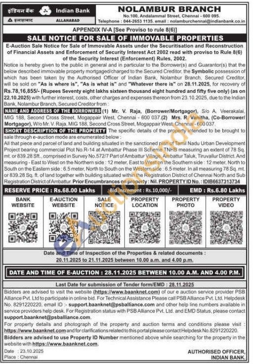 All that piece and parcel of land and building situated in the sanctioned plan of Tamil Nadu Urban Development Project bearing commercial Plot No.R-14 at Ambattur Phase III Scheme TNHB measuring an extent of 78 Sq. mt. or 839.28 Sft., comprised in Survey No.572/7 Part of Ambattur Village, Ambattur Taluk, Tiruvallur District. And measuring-East to West on the Northern side: 12 meter, East to West on the Southern side: 12 meter, North to South on the Eastern side: 6.5 meter, North to South on the Western side: 6.5 meter. In all measuring 78 Sq.mt. or 839.28 Sq. ft. of land together with building situated within the Registration District of Chennai North and Sub Registration District of Ambattur.