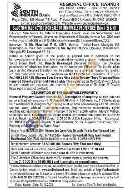 All that part and parcel of land admeasuring 4.18 Cents comprised in O.S.No. 1464, Re.S.No.10 W5 81 of Kannur-1 Village, Kannur Taluk, Kannur District along with residential building bearing No.TVE-36-83, Ward 36 admeasuring approx. 3800 Sq. FL. together with all other improvements made thereen, owned by Mr. Basheer K. B. more fully described in Registered Jenmam Deed No.4664/2006 dated 12.12.2006 of SRO Kannur. BOUNDARIES: North Property of Musthafa, East: Private Road, South: Municipal Road, West: Property of Musthafa.(8) All that part and parcel of land admeasuring 1.50 Cents comprised in O.S.No. 1467, Re.S.No.10 W5 B1 of Kannur-1 Village, Kannur Taluk, Kannur District together with all other improvements made thereon, owned by Mr. Basheer K. B. more fully described in Registered Sale Deed No.4156/2013 dated 24.12.2013 of SRO Kannur. BOUNDARIES: North: Property of Basheer, Onam Thak & property sold by Musthafa, East: Property of Basheer, South: Municipal Road and Randem Thak, West: Municipal Road