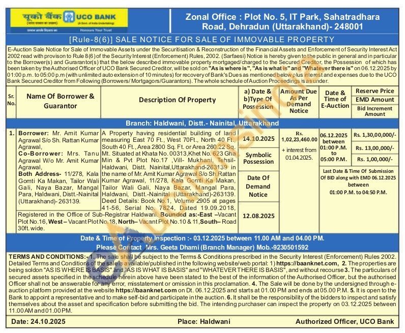 Property having residential building of land measuring East 70 Ft., West 70Ft., North 40 Ft., South 40 Ft., Area 2800 Sq. Ft. or Area 260.22 Sq. Mt. Situated at Khata No. 00313, Khet No. 623 Gha Min & Pvt Plot No.17 Vill- Mukhani, Tehsil-Haldwani, Distt. Nainital, Uttarakhand-263139 in the name of Mr. Amit Kumar Agrawal S/o Sh.Rattan Kumar Agrawal, 11/278, Kala Gomti Ka Makan, Tailor Wali Gali, Naya Bazar, Mangal Para, Haldwani, Distt.-Nainital (Uttarakhand)-263139. Deed Details: Book No.1, Volume 2905 at pages 41-56, Serial No. 7824, Dated 19.09.2018, Registered in the Office of Sub-Registrar Haldwani.