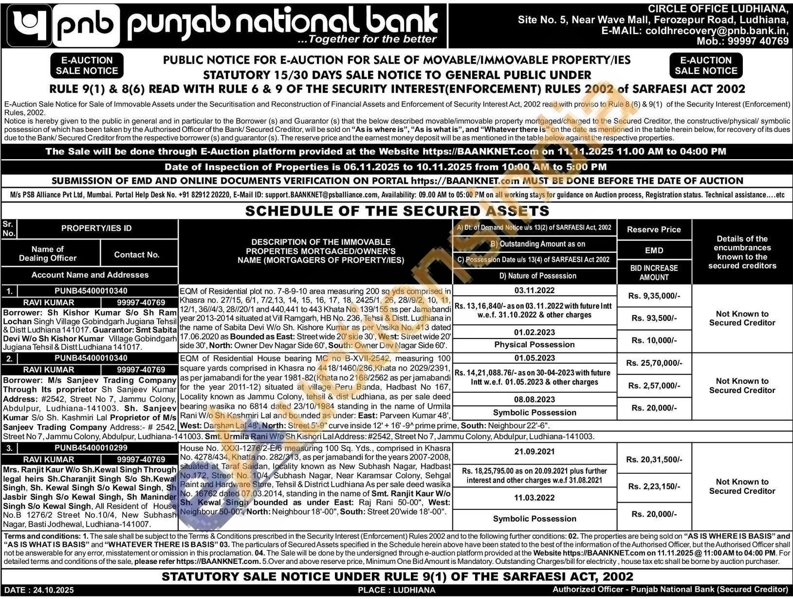House no . XXXI-1276/2-E/6 measuring 100 Sq. Yds., comprised in Khasra No. 4278/434, Khatta no. 282/313, as per jamabandi for the years 2007-2008 Taraf Saidan, locality known as New Subhash Nagar, Hadbast Street No. 10/4, Subhash Nagar, Near Karamsar Colony, Sehgal Hardware Store, Tehsil & District Ludhiana