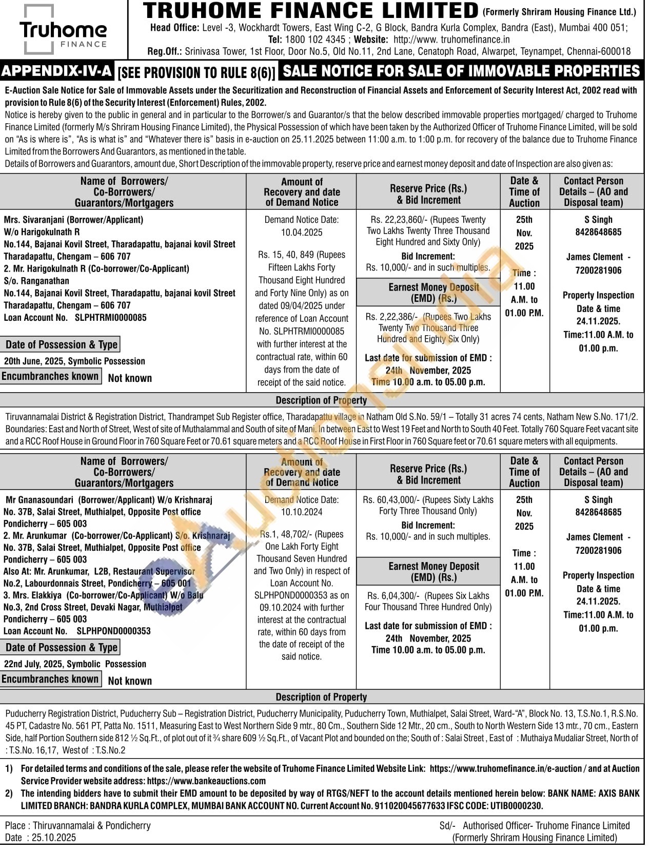 Tiruvannamalai District & Registration District, Thandrampet Sub Register office, Tharadapattu village in Natham Old S.No. 59/1-Totally 31 acres 74 cents, Natham New S.No. 171/2. Boundaries: East and North of Street, West of site of Muthalammal and South of site of Mani. In between East to West 19 Feet and North to South 40 Feet. Totally 760 Square Feet vacant site and a RCC Roof House in Ground Floor in 760 Square Feet or 70.61 square meters and a RCC Roof House in First Floor in 760 Square feet or 70.61 square meters with all equipments.