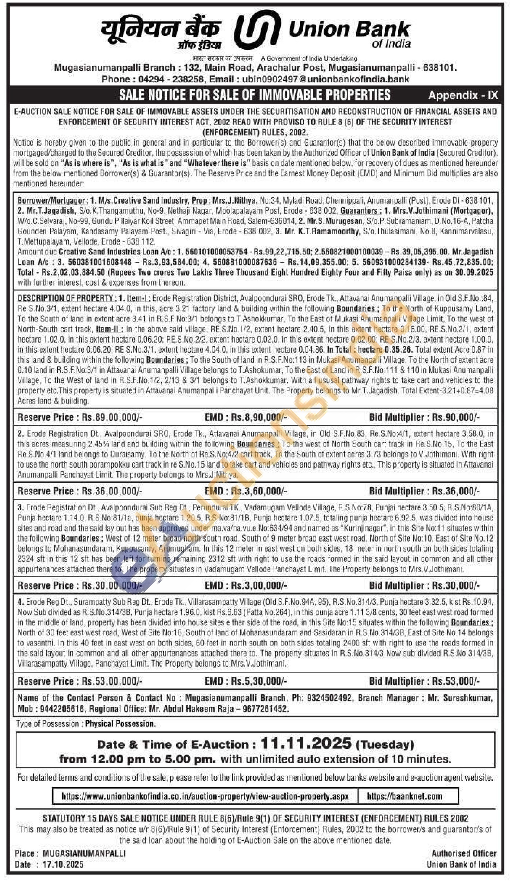 1. Item-1: Erode Registration District, Avalpoondurai SRO, Erode Tk. Attavanai Anumanpalli Village, in Old S F.No.:84, Re S. No.3/1, extent hectare 4.04.0, in this, acre 3.21 factory land & building within the following Boundaries; To the North of Kuppusamy Land, To the South of land in extent acre 3.41 in R.S.F.No:3/1 belongs to T.Ashokkumar, To the East of Mukasi Anumanpali Village Limit, To the west of North-South cart track, Item-II: In the above said village, RE S.No.1/2, extent hectare 2.40.5, in this extent hectare 0.16.00, RE.S.No.2/1, extent hectare 1.02.0. in this extent hectare 0.06.20. RES.No.2/2. extent hectare 0.02.0, in this extent hectare 0.02.00: RE.S.No 2/3, extent hectare 1.00.0. in this extent hectare 0.06 20, RE S.No.3/1, extent hectare 4.04.0, in this extent hectare 0.04.86. In Total: hectare 0.35.25. Total extent Acre 0.87 in this land & building within the following Boundaries: To the South of land in RS F.No 113 in Mukasi Anumanpalli Village, To the North of extent acre 0.10 land in R.S.F.No:3/1 in Attavonai Anumanpalli Village belongs to T.Ashokumar, To the East of Land in R.S.F.No:111 & 110 in Mukasi Anumanpalli Village, To the West of land in R.S.F.No. 1/2, 2/13 & 3/1 belongs to T.Ashokkumar, With all ususal pathway rights to take cart and vehicles to the property etc. This property is situated in Attavanai Anumanpalli Panchayat Unit. The Property belongs to Mr.T. Jagadish. Total Extent-3.21+0.87-4.08 Acres land & building