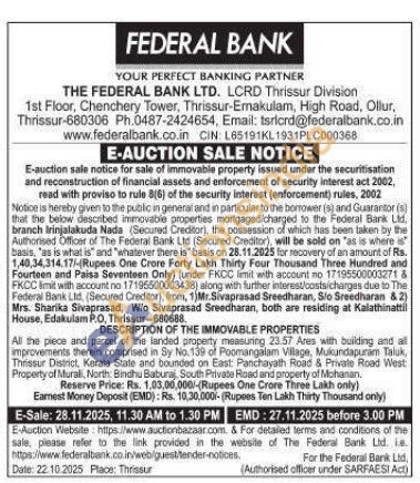 All the piece and parcel of the landed property measuing 23.57 Ares with building and all improvements therein comprised in Sy No. 139 of Poomangalam Village, Mukundapuram Taluk, Thrissur District, Kerala Stale and bounded on East: Panchayath Road & Private Road West: Property of Murali, North: Bindhu Baburaj, South Private Road and property of Mohanan