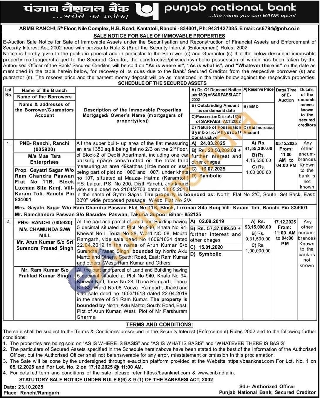 All the part and parcel of Land and Building having 5 decimal situated at Plot No 940, Khata No 94, Khewat No 1, Touzi No 28, Ward NO 08, Mouza Ramgarh, vide sale deed No 1609/1624 dated 22.04.2019 in the name of Arun Kumar S/o Surendra Prasad Singh, bounded by North: Aklu Mahto and Others, South: Road, East: Ram Kumar and others, West: Ram Kumar and Others.