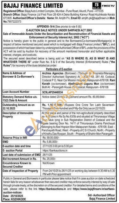 All that piece and parcel of the non-agricultural property described as-4.05 ares in Re Sy No.63/5b and situated at Thirunavaya Village Titur Taluk lying in Sub Registration District of Codacal and the house bearing Door No. 14/11 of Thirunavaya Grama Panchayat belonging to Abel Hopson Mon Malapuram Kerala-676108. East-Panchayath Road, West: -Property of CSI Church, North-Property of Kristhu Das Roopan South-Property of Shahin Mon Parangath