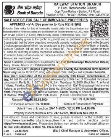 Give short description of the immovable property with known encumbrances, if any: All that the part and parcel of land admeasuring 0.0654 Hec of Converted Puriyadam comprised in Re-Sy No. 613/37 (Old Sy No.6/4), Thandaper No.9615, Block No. 17, in Parali I Village, Palakkad Dist, Palakkad SRO in the Name of Mr. Elaf Thottuvaloppil Mohammed Rafeeq as per the Regd. Janmam Sale Deed No. 2791/2023 of SRO Palakkad Boundaries: North: Property of Riyas and Nilam of Madhavi, South: Property of Shafeel, East: Property of Madhavi, West: 4 Meter Width Path, Riyas