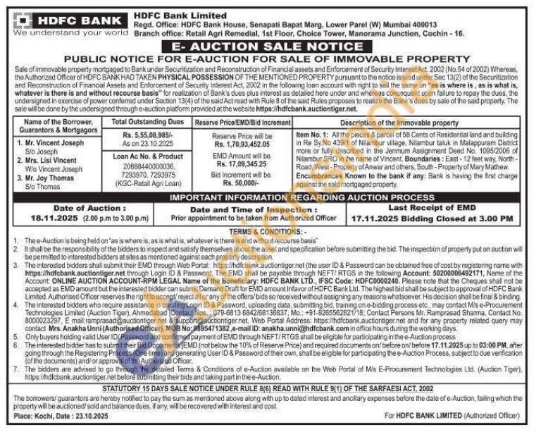 All the pieces & parcel of 58 Cents of Residential land and building in Re Sy.No 439/1 of Nilambur village, Nilambur taluk in Malappuram District more or fully described in the Jenmum Assignment Deed No. 1095/2006 of Nilambur SRO in the name of Vincent. Boundaries: East-12 feet way, North-Road, West-Property of Anwar and others, South-Property of Mary Mathew. Encumbrances Known to the bank if any: Bank is having the first charge against the said mortgaged property