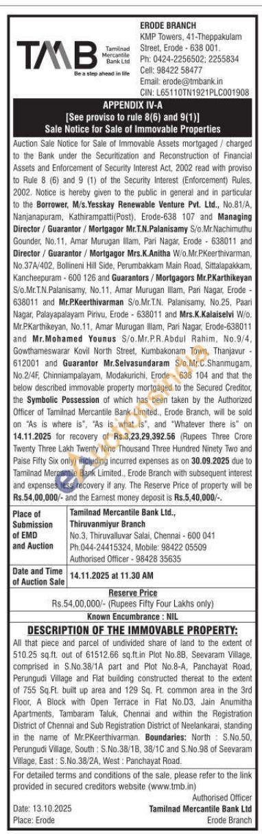 All that piece and parcel of undivided share of land to the extent of 510.25 sq.ft. out of 61512.66 sq.ft.in Plot No.88, Seevaram Village. comprised in S.No.38/1A part and Plot No.8-A, Panchayat Road, Perungudi Village and Flat building constructed thereat to the extent of 755 Sq.Ft. built up area and 129 Sq. Ft. common area in the 3rd Floor, A Block with Open Terrace in Flat No.D3, Jain Anumitha Apartments, Tambaram Taluk, Chennai and within the Registration District of Chennai and Sub Registration District of Neelankarai, standing in the name of Mr.P.Keerthivarman. Boundaries: North S.No.50. Perungudi Village, South: S.No.38/18, 38/1C and S.No.98 of Seevaram Village, East: S.No.38/2A, West: Panchayat Road.