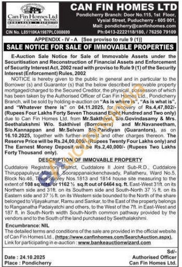 Cuddalore Registration District, Cuddalore II Joint Sub-R.D., Cuddalore Thiruppapuliyur Madura, Soorappanaickenchavady, Pallatheru, Ward No.5, Block No 46, Town Survey Nos. 1813 and 1814 house site measuring to the extent of 108 sq.mts. or 1162 1/2 sq.ft out of 6464 sq. ft. East-West 31ft. on its Northern side and 31ft on its Southern side and South-North 37 1/2ft. on its Eastern side and 37% ft. on its Westem side bounded to the North of the share belonged to Vijayakumar, Ramu and Sankar, to the East of the property belongs to Ranganatha Padaiyatchi and others, to the West of the 7ft. in East-West and 187 ft. in South-North width South-North common pathway provided by the vendors and to the South of the land purchased by Seethalakshmi