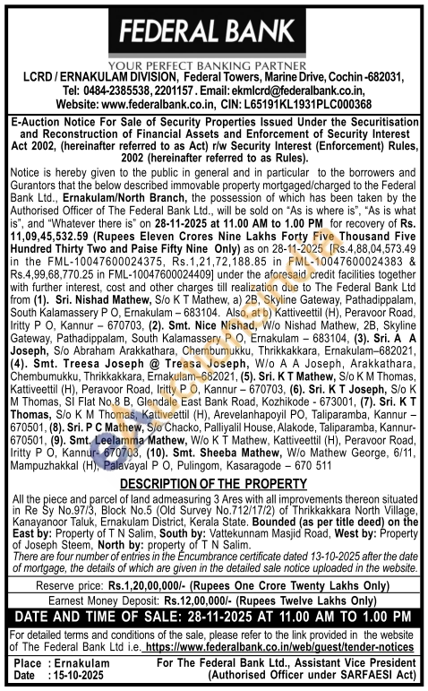 All the piece and parcel of land admeasuring 3 Ares with all improvements thereon situated in Re Sy No.97/3, Block No.5 (Old Survey No.712/17/2) of Thrikkakkara North Village, Kanayanoor Taluk, Ernakulam District, Kerala State. Bounded (as per title deed) on the East by: Property of T N Salim, South by: Vattekunnam Masjid Road, West by: Property of Joseph Steem, North by: property of T N Salim.