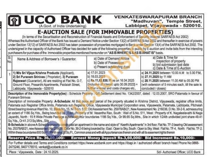 Description of Immovable Property: A-Schedule: All that piece and parcel of the property siluated in Krishna District, Vijayawada, registrar office limits, Patamata sub Registrar Office limits, Patamata sub Registrar Office, Vijayawada Municipal Corporation area, Vijayawada, Patamata, Labbipeta, Pitchaiah Street bearing revenue Ward No. 10, Block No. 15, NTS No. 510, Old Assessment No. 25978AB/21, New Assessment No. 216036, D.No. 39-2-6, admeasuring an extent of 1186 Sq. Yds,, Being bounded by: East: Property of M. Vasantha Rao, South Wall of S.No. 511, West: Property of K. Nagaleelavathi & Naga Jayanthi, North: 15 ft Wide Private Passage in between four boundaries 1186 Sq. Yds., Or 99.65 Sq.Mtrs., Site in which 1/24th undivided joint share 49.41 Sq. Yds., Or 41.313 Sq.Mirs., Site B-Schedule:in above A-Schedule proeprty constructed an apartment in the name and style of Keerthi Apartments" in 3rd floor, Flat No. TF-3 bearing Old assessment No. 25378AB/21, new Assessment No. 216036, Door No. 39-2-6 being bounded by: East: Open to Sky, South: Open to Sky, West: Flat No. TF-4, North: Flat No. TF-2 Within these boundaries 600 Sq. Ft, Plinth area 20 Sq.Ft., Common area and with all Appurtenances therein and with all its easement rights therein