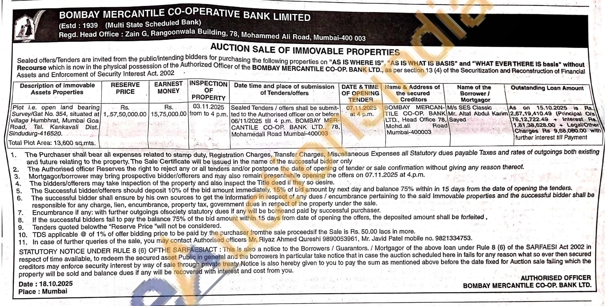 Sealed Tenders/offers shall be submit-06/11/2025 till 4 p.m. BOMBAY MER-CANTILE CO-OP. BANK LTD., 78, Mohamedali Road Mumbai-400003 ted to the Authorised officer on or before
