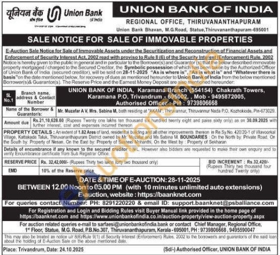 Karamana Branch Mobile No : 9495872005 / Authorised Officer Phone No : 9739806668 / 9495590047