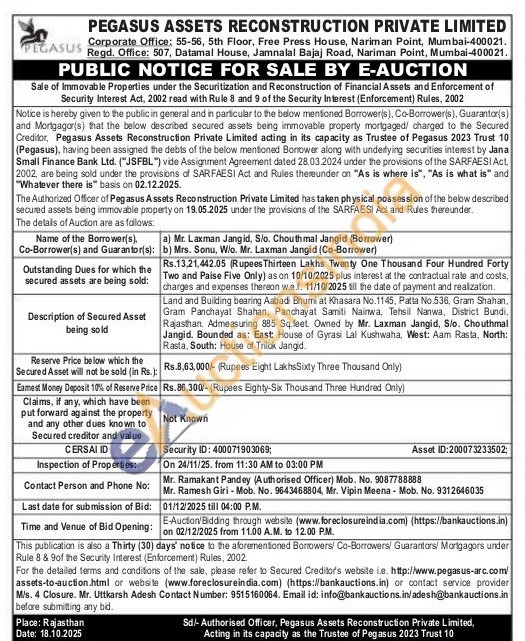 Land and Building bearing Aabadi Bhumi at Khasara No.1145, Patta No.536, Gram Shahan, Gram Panchayat Shahan, Panchayat Samiti Nainwa, Tehsil Nanwa, District Bundi. Rajasthan, Admeasuring 885 Sq feet. Owned by Mr. Laxman Jangid, Sio. Chouthmal Jangid. Bounded as: East House of Gyrasi Lal Kushwaha, West: Aam Rasta, North: Rasta, South: House of Trilok Jangid.