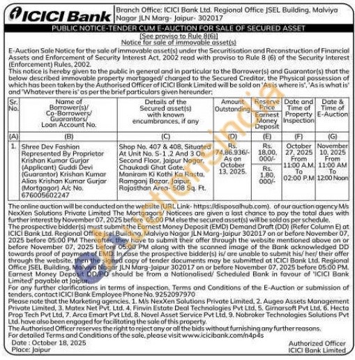 Shop No. 407 & 408, Situated At Unit No. S-1.2 And 3 On Second Floor, Jaipur Nagar. Chaukadi Ghat Gate, Maniram Ki Kothi Ka Rasta. Ramganj Bazar, Jaipur, Rajasthan Area-508 Sq. Ft.