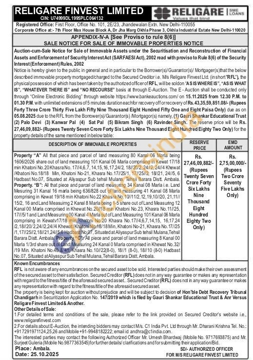 Property "A" All that piece and parcel of land measuring 80 Kanal 06 Maria being 1606/2026 share out of land measuring 101 Kanal 06 Marla comprising in Kewat 17/18 min Khatoni No.20 Khasra No. 17/14,6,7,14,15,16,17,24/2, 18//20/2,24/12, 24/14 Khewat /Khatoni No.18/18 Min, Khatoni No-21, Khasra No. 17//25/1, 17/25//2, 18/21, 24//5, 6 Hadbast No.07, Situated at Allyaspur Sub tehsil Mulana, Tehsil Barara Distt. Ambala. Property. "B": All that piece and parcel of land measuring 34 Kanal 08 Maria i.e. Land Mesuring 31 Kanal 16 marla being 636/828 out of land measuring 41 Kanal 08 María comprising in Kewat 19/18 min Khatoni No.22 Khasra No. 10//11/2, 12, 19,10//20, 21,11//15/2, 16 and Land Measuing 2 Kanal 8 Marla being 1-5 share out of Land Measuring 12 Kanal 00 Marla comprised in Khewat No. 20//18 min Khatoni No.23, Khasra No. 11/25, 17/1/5/1 and Land Measuring 00 Kanal 4 Marla out of Land Measuring 101 Kanal 06 Marla comprising in Kewatv17/18 min Khatoni No.20 Khasra No. 17/4,6,7,14,15, 16,17,24 12,18//20/2,24//2,24/14 Khewat/Khatoni No.18/18 Min, Khatoni No-21, Khasra No. 17//25 /1,17//25/2, 18//21,24/5,6 Hadbast No.07, Situated at Aliyaspur Sub tehsil Mulana, Tehsil Barara Distt. Ambala. Property "C": All piece and parcel of land measuring 8 Kanal 00 Maria 1/3rd share out of Land Measuring 24 Kanal 0 Marla comprised in Khewat No.32//19 Min, Khatoni No.40 & 41, Khasra No. 10/22(8-0), 18//1 (8-0), 18//10 (8-0) Hadbast No.07, Situated at Aliyaspur Sub Tehsil Mulana, Tehsil Barara Distt. Ambala.