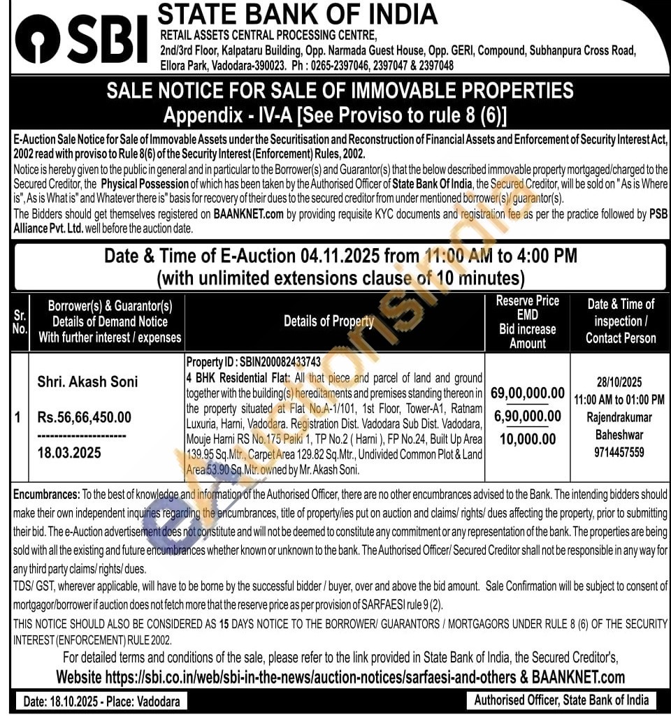 4 BHK Residential Flat: All that piece and parcel of land and ground together with the building(s) hereditaments and premises standing thereon in the property situated at Flat No.A-1/101, 1st Floor, Tower-A1, Ratnam Luxuria, Harni, Vadodara. Registration Dist. Vadodara Sub Dist. Vadodara, Mouje Harni RS No.175 Paiki 1, TP No.2 (Harni), FP No.24, Built Up Area 139.95 Sq.Mtr., Carpet Area 129.82 Sq.Mtr., Undivided Common Plot & Land Area 53.90 Sq.Mtr. owned by Mr. Akash Soni.