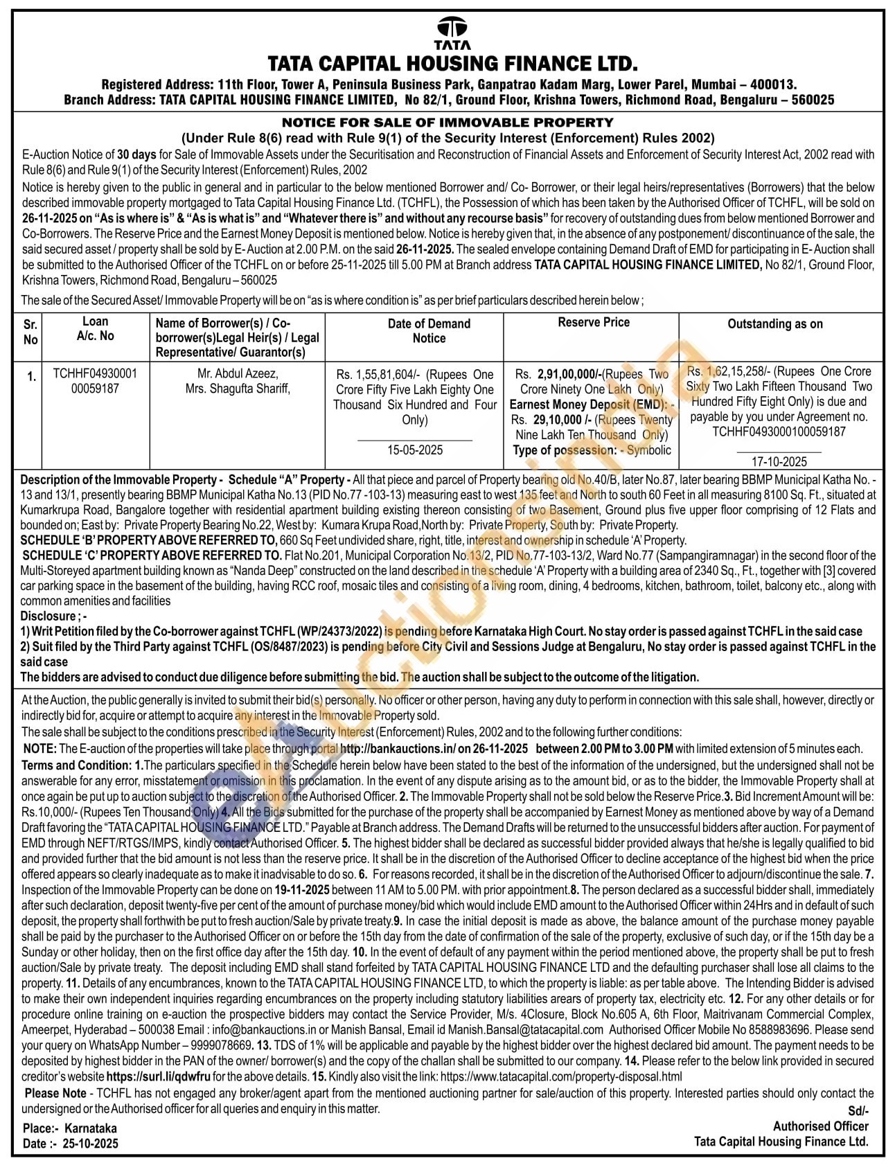 Description of the Immovable Property - Schedule "A" Property - All that piece and parcel of Property bearing old No.40/B, later No.87, later bearing BBMP Municipal Katha No.-13 and 13/1, presently bearing BBMP Municipal Katha No. 13 (PID No.77-103-13) measuring east to west 135 feet and North to south 60 Feet in all measuring 8100 Sq. Ft., situated at Kumarkrupa Road, Bangalore together with residential apartment building existing thereon consisting of two Basement, Ground plus five upper floor comprising of 12 Flats and bounded on; East by: Private Property Bearing No.22. West by: Kumara Krupa Road, North by: Private Property, South by: Private Property. SCHEDULE 'B'PROPERTY ABOVE REFERRED TO, 660 Sq Feet undivided share, right, title, interest and ownership in schedule 'A' Property.