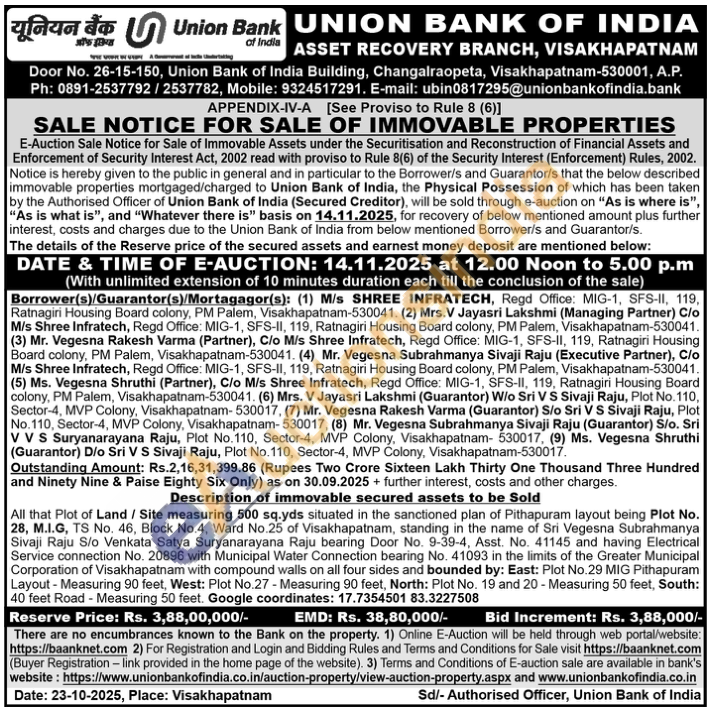 Description of immovable secured assets to be Sold : All that Plot of Land / Site measuring 500 sq.yds situated in the sanctioned plan of Pithapuram layout being Plot No. 28, M.I.G, TS No. 46, Block No.4, Ward No.25 of Visakhapatnam, standing in the name of Sri Vegesna Subrahmanya Sivaji Raju S/o Venkata Satya Suryanarayana Raju bearing Door No. 9-39-4, Asst. No. 41145 and having Electrical Service connection No. 20896 with Municipal Water Connection bearing No. 41093 in the limits of the Greater Municipal Corporation of Visakhapatnam with compound walls on all four sides and bounded by: East: Plot No.29 MIG Pithapuram Layout - Measuring 90 feet, West: Plot No.27-Measuring 90 feet, North: Plot No. 19 and 20-Measuring 50 feet, South: 40 feet Road Measuring 50 feet. Google coordinates: 17.7354501 83.3227508
