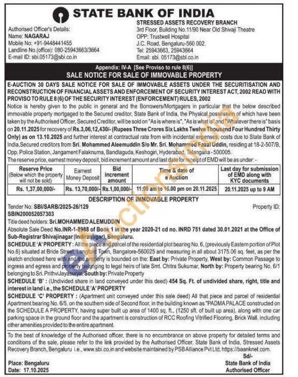 SCHEDULE 'A' PROPERTY: All the piece and parcel of the residential plot bearing No. 6, (previously Eastern portion of Plot No.6) situated at Bride Street, Langford Town, Bangalore-560025 and measuring in all about 3175.06 sq. feet, as per the sketch enclosed here with and the property is bounded on the: East by: Private Property, West by: Common Passage to ingress and egress and property belonging to legal heirs of late Smt. Chitra Sukumar, North by: Property bearing No. 6/1 belonging to Sri. Prithvi Jayasurya, South by: Private Property SCHEDULE 'B': (Undivided share in land conveyed under this deed) 454 Sq. Ft. of undivided share, right, title and interest in land i.e., the SCHEDULE 'A' PROPERTY SCHEDULE 'C' PROPERTY: (Apartment unit conveyed under this sale deed) All that piece and parcel of residential Apartment bearing No. 6/5, on the southern side of Second floor, in the building known as "PADMA PALACE constructed on the SCHEDULE A PROPERTY, having super built up area of 1400 sq. ft., (1250 sft. of built up area), along with one car parking space in the ground floor and the apartment is construction of RCC Roofing Vitrified Flooring, Brick Wall, including other amenities provided to the entire apartment.