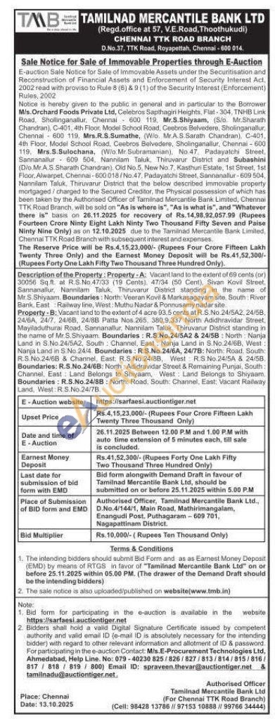 Property-A: Vacant land to the extent of 68 cents (or) 30056 Sq al R.S. No.47/33 (19 Cents), 47/34 (50 Cent), Sivan Kovil Street. Sannanallur, Nannitam Taluk, Thiruvarur District standing in the name of Mr.S Shiyaam. Boundaries: North: Veeran Kovil & Markasagayam site, South: River Bank, East Railway line, West: Muthu Nadar & Ponnusamy nadar site Property-B: Vacant land to the extent of 4 acre 93.5 cents at R. S.No.24/542, 24/58. 24/6A, 24/7, 24/68, 24/88 Patta Nos. 265. 380.9.337 North Adidhravidar Street, Mayiladuthurai Road, Sannanallur, Nannilam Tatuk. Thiruvarur Distr District standing in the name of Mr. S. Shiyaam Boundaries: R.S.No.24/5A2 & 24/58: North Nanja Land in S.No.24/5A2, South Channel, East: Nanja Land in S.No.24/6B, West: Nanja Land in 5 No 24/4 Boundaries: R.S.No. 24/6A, 24/78: North: Road. South RS No.24/68 & Channel, East. R.S. No 24/88, West RS No 24/5A & 24/58 Boundaries: R.S.No.24/68: North: Adidravidar Street & Remaining Punjai, South: Channel. East Land Belongs to Shiyaam, West Land Belongs to Shiyaam. Boundaries: R.5.No.24/BB: North: Road, South: Channel, East: Vacant Raiteary Land, West RS.No 24/78