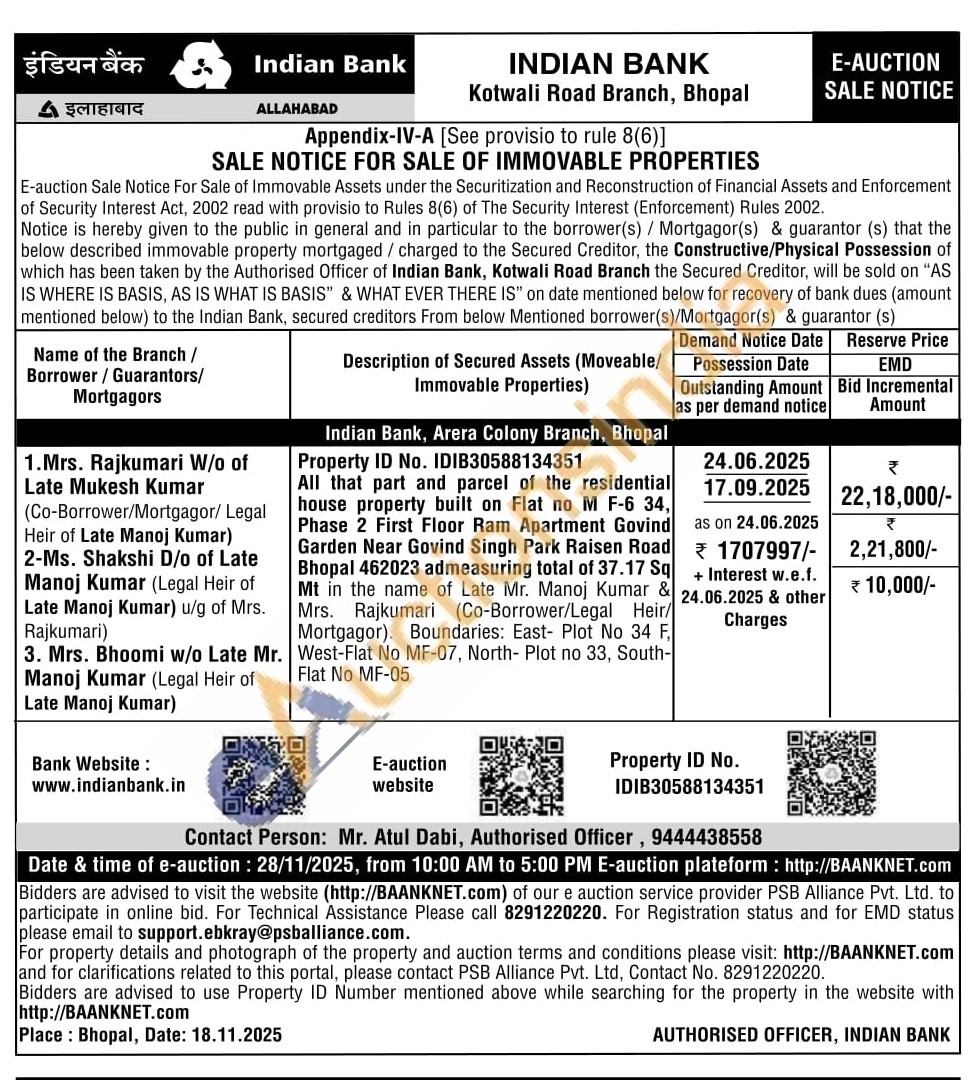 All that part and parcel of the residential house property built on Flat no M F-6 34, Phase 2 First Floor Ram Apartment Govind Garden Near Govind Singh Park Raisen Road Bhopal 462023 admeasuring total of 37.17 Sq Mt in the name of Late Mr. Manoj Kumar & Mrs. Rajkumari (Co-Borrower/Legal Heir/Mortgagor). Boundaries: East- Plot No 34 F, West-Flat No MF-07, North- Plot no 33, South-Flat No MF-05