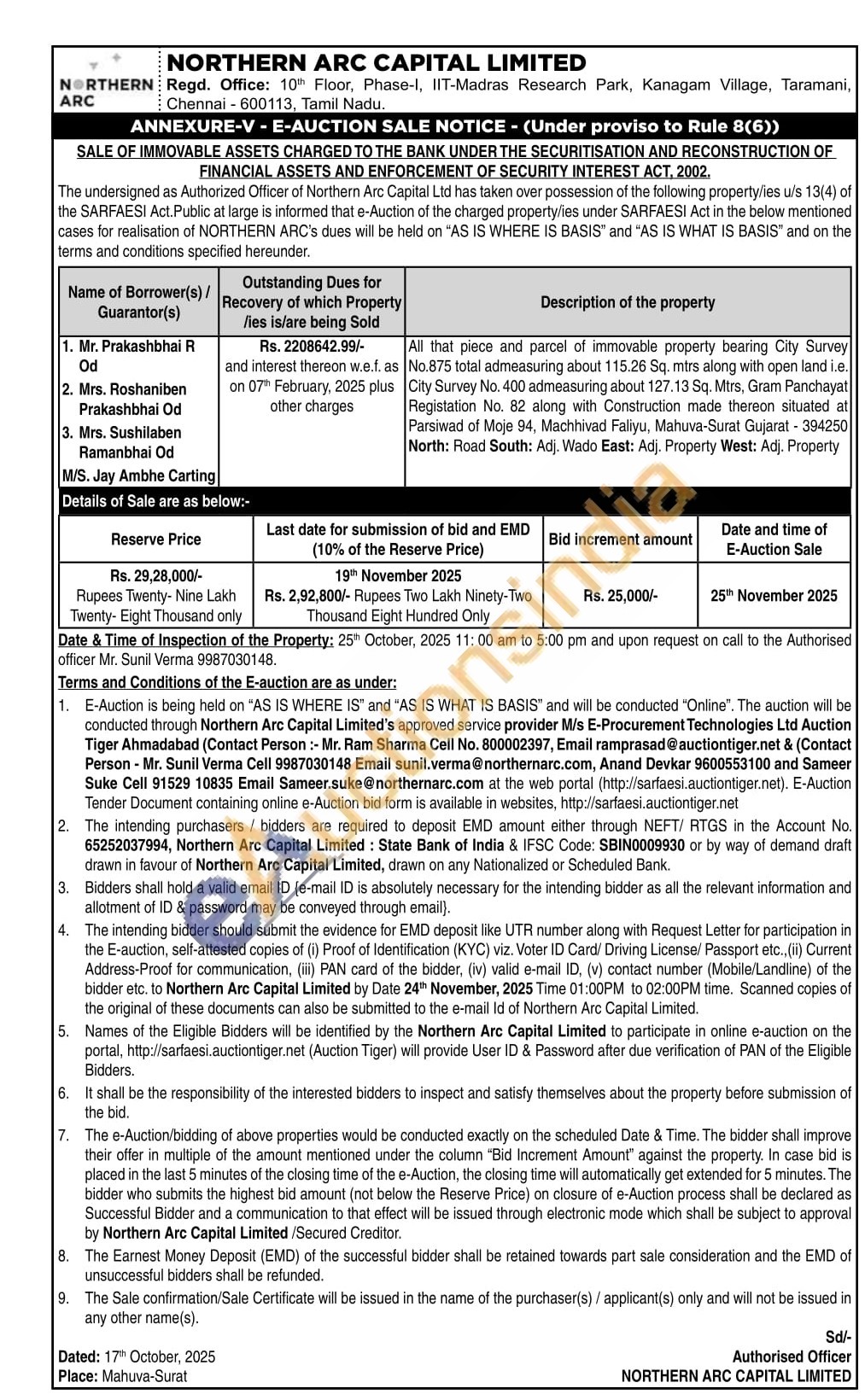 All that piece and parcel of immovable property bearing City Survey No.875 total admeasuring about 115.26 Sq. mtrs along with open land i.e. City Survey No. 400 admeasuring about 127.13 Sq. Mtrs, Gram Panchayat Registation No. 82 along with Construction made thereon situated at Parsiwad of Moje 94, Machhivad Faliyu, Mahuva-Surat Gujarat - 394250 North: Road South: Adj. Wado East: Adj. Property West: Adj. Property