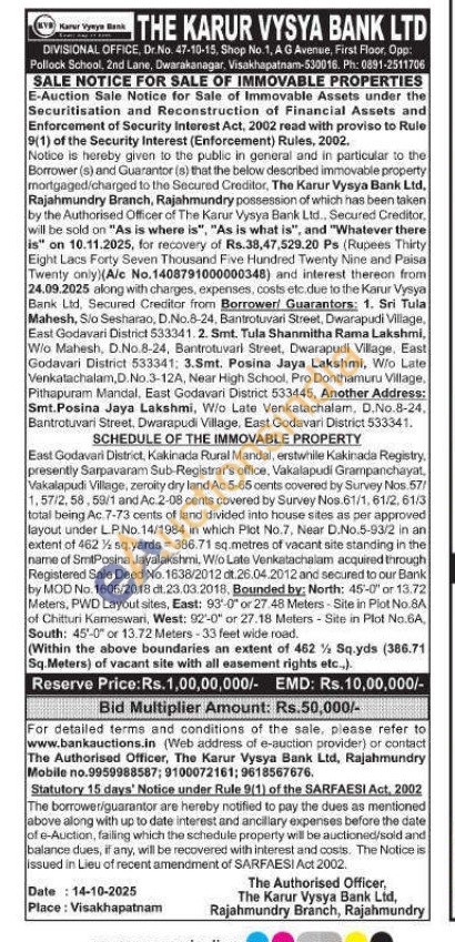 Authorised Officer,Rajahmundry Mobile no.9959988587; 9100072161; 9618567676