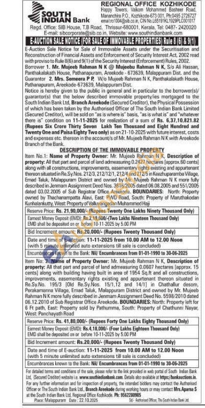 All that part and parcel of land admeasuring 0.2427 hectares (approx. 50 cents) along with all constructions, improvements, easementary rights existing and appurtenant thereon situated in Re.Sy.Nos. 212/3, 212/12/1, 212/4 and 212/5 in Keezhuparamba Village, Emad Taluk, Malappuram District and owned by Mr. Mujeeb Rahman NK more fully described in Jenmam Assignment Deed Nos. 3616/2005 dated 06.08.2005 and 551/2005 dated 03.02.2005 of Sub Registrar Office Areekode. BOUNDARIES: North: Property owned by Thachanampatta Alavi, East: PWD Road, South: Property of Maruthakodan Kunhalankutty, West: Property of Valluvangadan Muhammed Haji