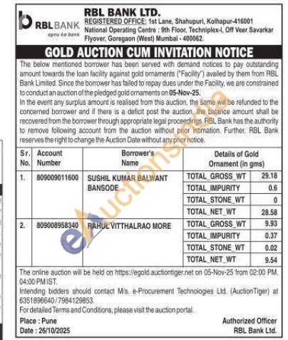 RBL Bank Gold Auctions Auction in Pune