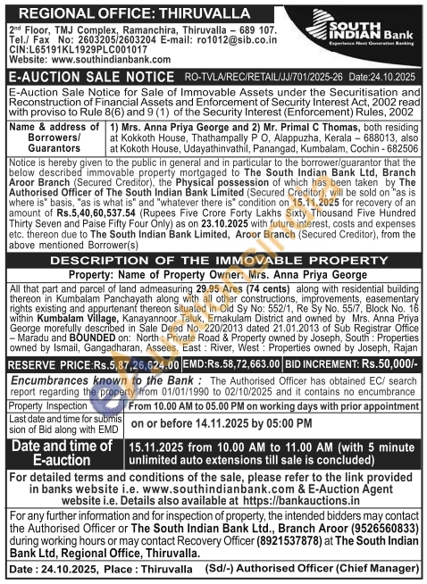 All that part and parcel of land admeasuring 29.95 Ares (74 cents) along with residential building thereon in Kumbalam Panchayath along with all other constructions, improvements, easementary rights existing and appurtenant thereon situated in Old Sy No: 552/1, Re Sy No. 55/7, Block No. 16 within Kumbalam Village, Kanayannoor Taluk, Ernakulam District and owned by Mrs. Anna Priya George morefully described in Sale Deed No. 220/2013 dated 21.01.2013 of Sub Registrar Office - Maradu and BOUNDED on: North: Private Road & Property owned by Joseph, South: Properties owned by Ismail, Gangadharan, Assees. East River, West: Properties owned by Joseph, Rajan