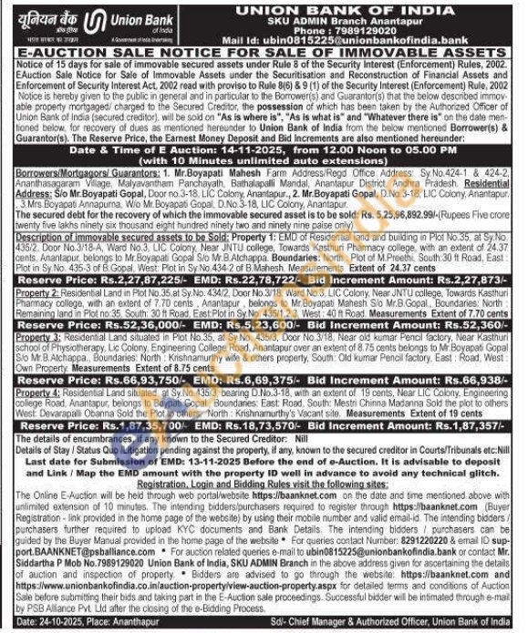 EMD of Residential land and buliding in Plot No 35, at Sy. No 435/2, Door No.3/18-A, Ward No.3, LIC Colony, Near JNTU college, Towards Kasthuri Pharmacy college, with an extent of 24.37 cents, Anantapur, belongs to Mr. Boyapati Gopal Sto Mr.B.Atchappa. Boundaries: North Plot of M.Preethi, South:30 ft Road, East Plot in Sy No. 435-3 of B. Gopal, West Plot in Sy No. 434-2 of B. Mahesh. Measurements Extent of 24.37 cents