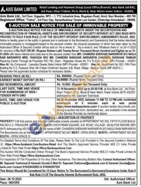 PROPERTY 1 Al that pieces and parcel of immovable propety situated at APPARTMENT NO 502, FIFTH FLOOR BUILD ING NO C-2. TREASURE VIHAR, MR-3 NEAR CHOITHRAM SQUARE, AB. ROAD, VILLAGE-BIJALPUR INDORE (MP) M.P) Admeasuring-450 SQ.FT SB. In the name of MR. CHANDRA SHEKHAR NARVARIYA SIO NAGJI RAM NARVARIYA The Boundraries are as follows. EAST-APPARTMENT NO.501 WEST OPEN SPACE NORTH APPARTMENT NO.503 SOUTH OPEN SPACE D