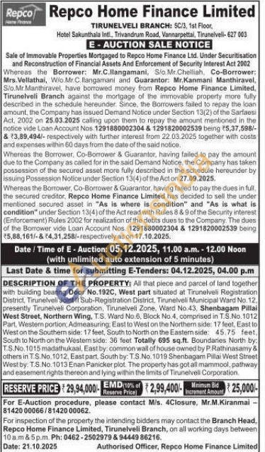All that piece and parcel of land together with building bearing Door No.192C, West part situated at Tirunelveli Registration District, Tirunelveli Joint il Sub-Registration District, Tirunelveli Municipal Ward No. 12. presently Tirunelveli Corporation, Tirunelveli Zone, Ward No. 43, Shenbagam Pillai West Street, Northern Wing, T.S. Ward No. 6, Block No.4, comprised in T.S.No. 1012 Part, Western portion, Admeasuring: East to West on the Northern side: 17 feet, East to West on the Southern side: 17 feet, South to North on the Eastern side: 45.75 feet, South to North on the Western side: 36 feet Totally 695 sq.ft. Boundaries North by: T.S.No. 1015 madathukaal, East by: common wall of house owned by P Rathinasamy & others in TS.No. 1012, East part, South by: T.S.No. 1019 Shenbagam Pillai West Street West by: T.S.No. 1013 Enan Panicker plot. The property has got all mammool, pathway and easement rights thereon and lying within the limits of Tirunelvell Corporation.